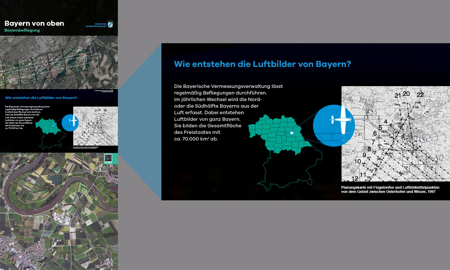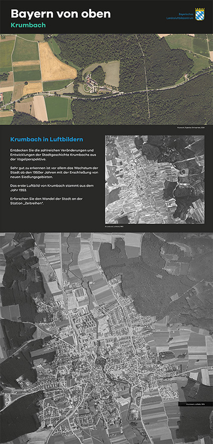 Anlässlich des fünfjährigen Bestehens des Bayerischen Landesluftbildzentrums stellte die Wanderausstellung dessen Angebote einem breiten Publikum vor. Die multimedial gestaltete und leicht verständlich aufbereitete Ausstellung vermittelt einen spannenden Einblick in die Geschichte und Technik der Luftbildfotografie. Auf 14 Ausstellungstafeln wurde den Besucherinnen und Besuchern gezeigt, wie Luftbilder gemacht werden, wie sie aufbereitet werden und wo sie eingesetzt werden.